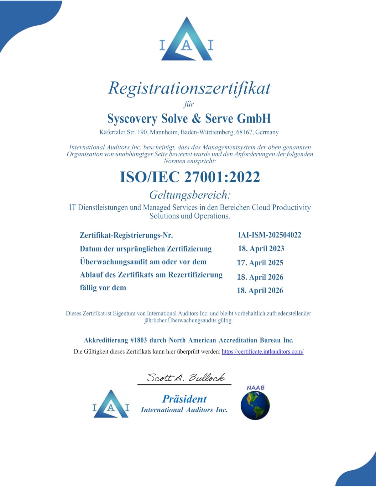 Syscovery ist erfolgreich nach ISO 27001 zertifizert. Diese Zertifizierung ist ein Beweis für unser Engagement, höchste Standards in der Informationssicherheit zu gewährleisten und Ihre Daten bestmöglich zu schützen.