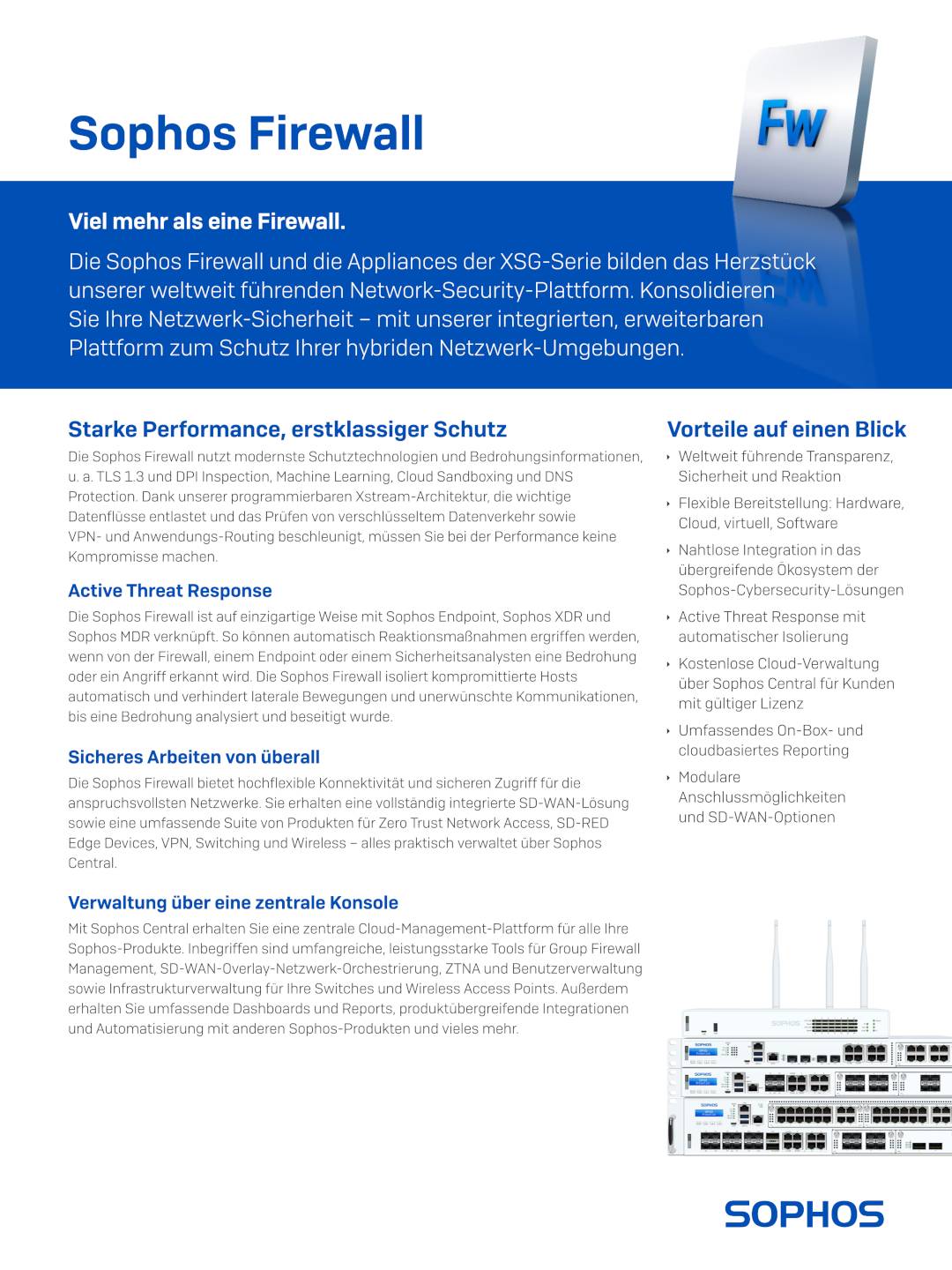 Die Sophos Firewall und die Appliances der XSG-Serie bilden das Herzstück unserer weltweit führenden Network-Security-Plattform. Konsolidieren Sie Ihre Netzwerk-Sicherheit – mit der integrierten, erweiterbaren Plattform zum Schutz Ihrer hybriden Netzwerk-Umgebungen. Mehr dazu hier!
