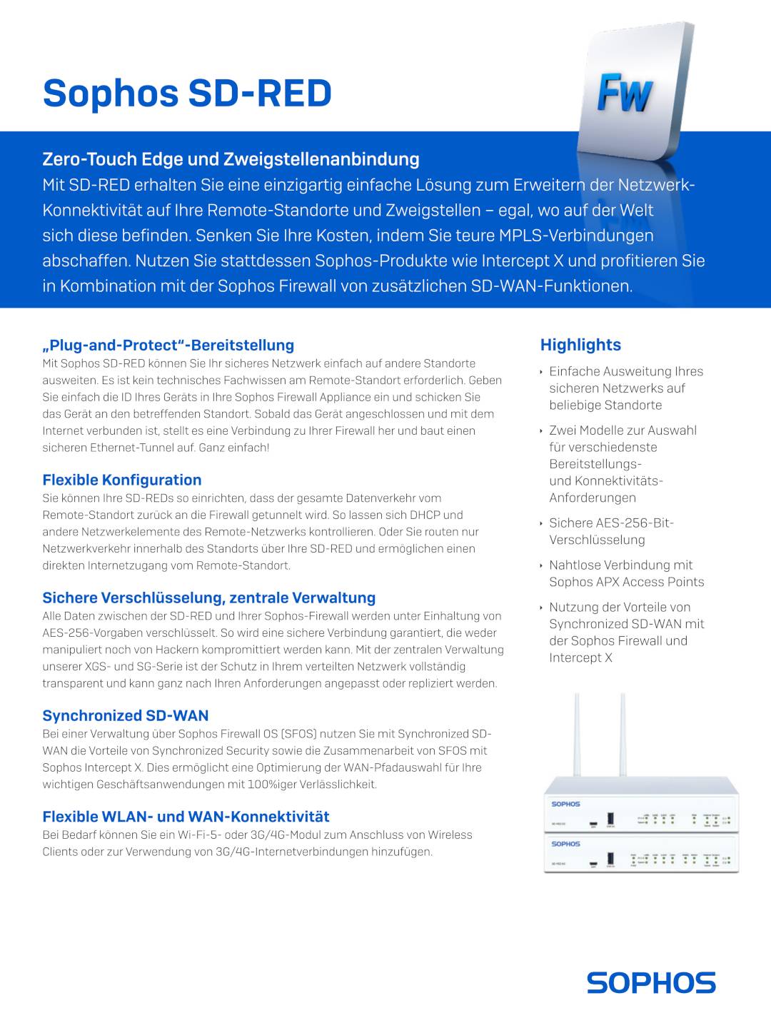 With SD-RED, you get a uniquely simple solution to extend network connectivity to your remote and branch offices - no matter where they are in the world. Reduce your costs by eliminating expensive MPLS connections. Instead, use Sophos products such as Intercept X and benefit from additional SD-WAN features in combination with Sophos Firewall. Find out more here!