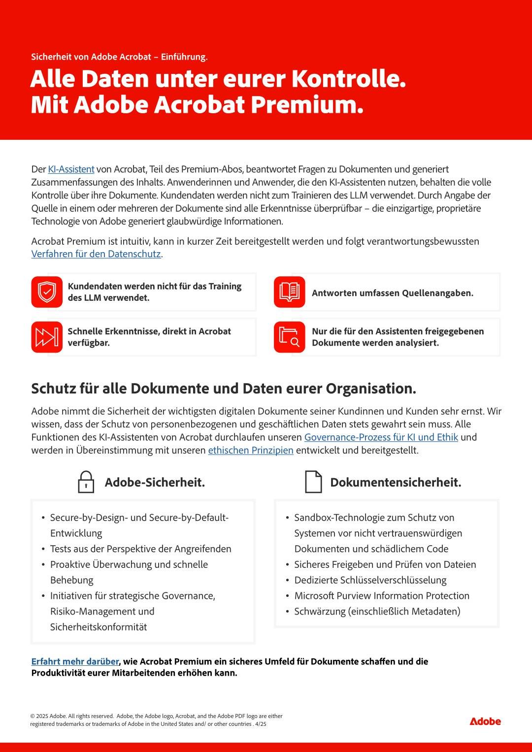Der KI-Assistent von Acrobat, Teil des Premium-Abos, beantwortet Fragen zu Dokumenten und generiert Zusammenfassungen des Inhalts. Anwenderinnen und Anwender, die den KI-Assistenten nutzen, behalten die volle Kontrolle über ihre Dokumente.