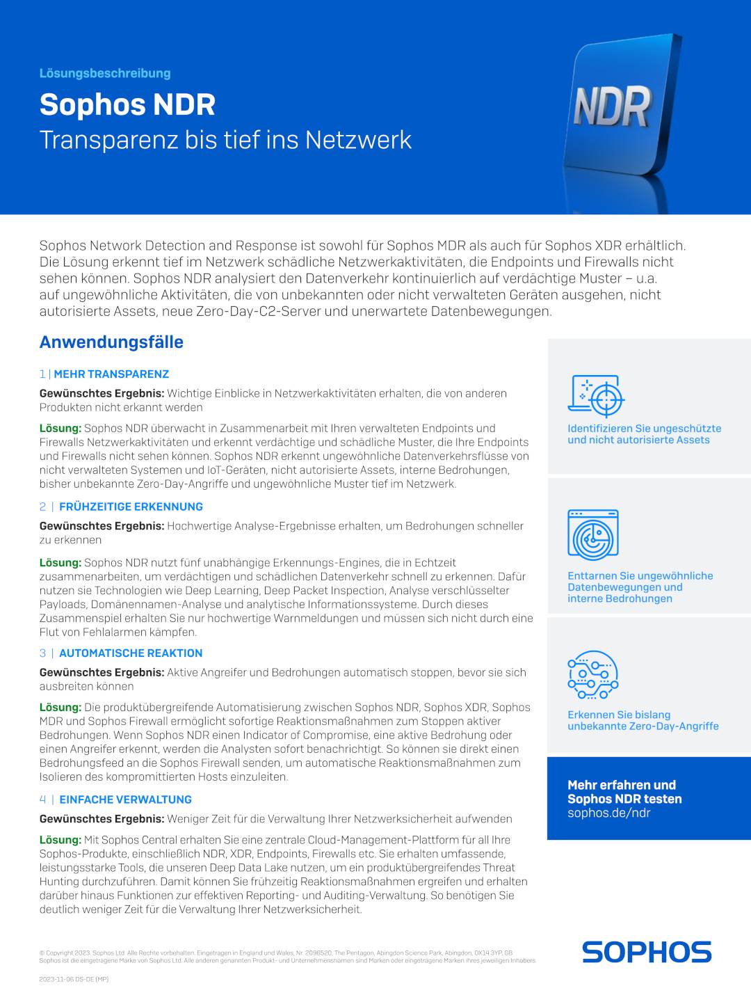 Sophos Network Detection and Response ist sowohl für Sophos MDR als auch für Sophos XDR erhältlich. Die Lösung erkennt tief im Netzwerk schädliche Netzwerkaktivitäten, die Endpoints und Firewalls nicht sehen können. Sophos NDR analysiert den Datenverkehr kontinuierlich auf verdächtige Muster – u.a. auf ungewöhnliche Aktivitäten, die von unbekannten oder nicht verwalteten Geräten ausgehen, nicht autorisierte Assets, neue Zero-Day-C2-Server und unerwartete Datenbewegungen. Mehr dazu hier!